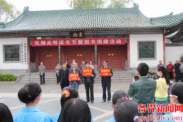各界网讯:4月23日,在第19个“世界读书日”到来之际,由凤翔县政协办、县委宣传部主办的“凤翔光明读书节暨图书捐赠活动”在凤翔东湖广场举行。县政协委员、秦凤路书店经理李红星向凤翔县老年大学、西街中学及竞存中学捐赠图书1500余份。