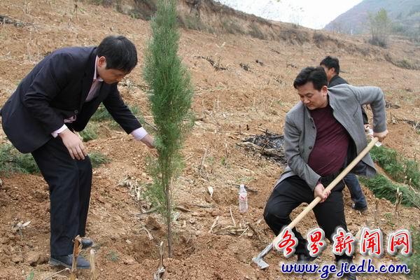 11月14日,全院干警集中在县城牛圈沟上指定的植树造林点上,按照植树技术标准要求,严把质量关,拉尺测量树坑深度、直径及树行的笔直度,直到符合要求为止。大家热情高涨,干劲十足,挥动铁锹,挖坑、栽树、填土、浇水,精心栽植树苗,个个忙得满头大汗。经过四个多小时的辛苦劳动,共完成绿化造林任务为20亩,栽植侧柏树3500株。