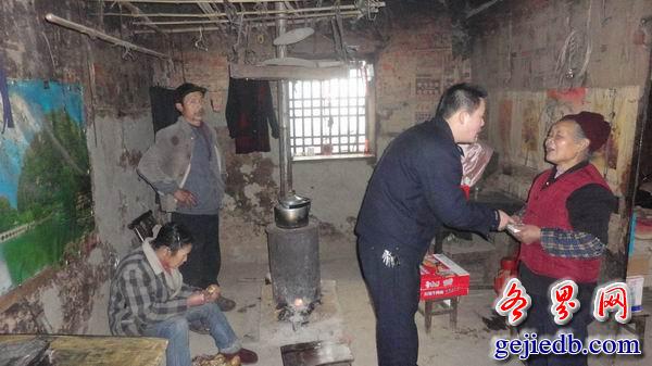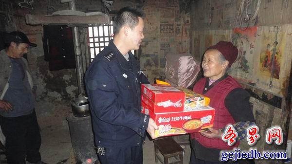 3 月7日上午,当民警来到宁陕县旬阳坝月河村贫困妇女杨秀莲老人家中时,发现屋内阴暗潮湿,光线很暗,但她们舍不得开灯。杨秀莲家中共有四口人,儿子和儿媳妇都是智障人,一孙子常年在外务工,自己体弱多病,儿子和儿媳妇不能干体力活都要杨秀莲亲自照顾,因此家中没有一个劳动力,一家人的生活陷入困境。了解这些情况后民警将事先准备好的物资和药品送入了她手中,并鼓励杨秀莲老人要勇敢面对生活,振奋精神,保重身体。