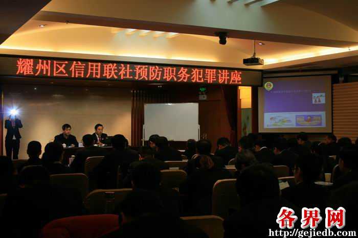 各界网讯(通讯员/李玉峰、雷婷、陈双阁)为深入学习贯彻十八大四中全会精神,着力预防金融领域职务犯罪问题的发生,2015年1月27日上午9时,耀州区人民检察院职务犯罪预防科科长李玉锋为区信用联社的领导、中层干部以及乡镇信用社干部等100余人上了一堂生动的法制讲座课。