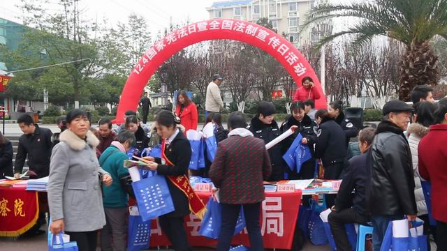 县委常委、统战部长刘家斌,县人大副主任冉龙华,县政府副县长、公安局长张鹏,县政协副主席赵以刚等领导到场检查指导活动开展,并为在国家宪法日暨法治宣传日系列活动之一的“七五”普法法治宣传一台戏剧本获奖者颁发了荣誉证书和奖金。现场参加集中宣传的40多家单位结合自身工作实际和业务特点,通过搭建设置宣传台,展出展板,利用LED、宣传车等设备循环滚动播放以宪法为主的法治宣传标语、视频、音频,发放法治宣传资料,现场解答群众法律咨询等形式,大力宣传党的十九大精神,宣传宪法、国家基本法律及行业部门法律法规。
