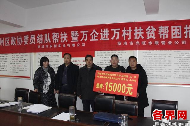 随后,区政协委员王锋、禹兴旺代表商洛市永恒实业有限公司和商洛市兴旺水暖管业公司,向结对帮扶的郭湾村捐赠15000元现金。据了解,这些捐赠资金将全部用于完善村基础设施建设。(闫欣)
