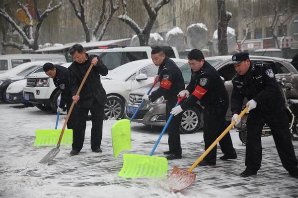 有人负责用铁锹铲、有人用除雪工具推、有人用扫帚清扫,不一会儿干警们的头发、眉毛都变成了白色,衣领上也盖满了厚厚的积雪。由于西长安街属于长安区主干道,早高峰沿街路上行人更是人头攒动,为了防止沿街商户门前积雪清理不及时引发安全事故,暖心的干警们每到一处,都会自觉帮助商户清理门前积雪,受到行人、沿街商户和环卫工的一致称赞。
