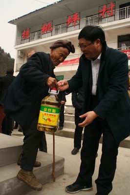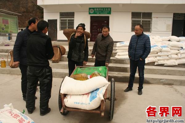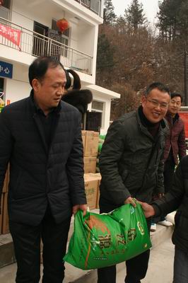 2018年2月9日,对于商南县十里坪镇核桃坪村老百姓来说,是一个幸福温暖的日子。在册贫困户手拉架子车,身负背篓,骑着摩托车,集中在核桃坪村服务中心操场,从商南农商银行包扶干部手中领取一份份米、面、油。手拄拐杖年逾八旬的张永高老人从商南农商银行党委书记、董事长段保江手中接过油壶感动地说:“如今党的政策真好,我做不动庄稼地农活儿啦,还叨扰你们让我过恁肥实的年。”