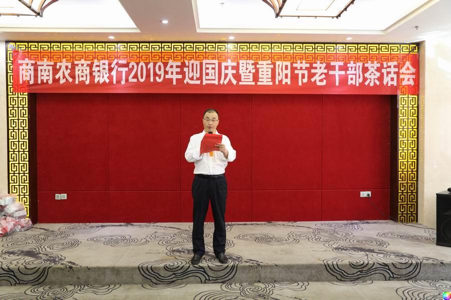 商南农商银行党委副书记、行长张成健讲话。张成健同志代表商南农商银行党委向全系统所有老职工表示节日问候与美好祝福,向所有关心支持老年工作的全体员工致以衷心感谢。张成健同志讲话指出,几十年来,在商南信合这块热土上,大家在不同时期、不同岗位,兢兢业业、无私奉献,为商南信合事业发展壮大倾注大量心血,挥洒辛勤汗水,做出积极贡献,在信合发展史上留下浓墨重彩。退休后,仍一如既往关心信合发展,用长期积累起来的丰富知识和宝贵经验,通过各种方式宣传信合,支持农商银行工作,这种胸怀大局、奋斗不止高贵品质和奉献精神,是农商银行的宝贵财富,值得全员尊重和赞誉。张成健同志还通报了商南农商银行2018年度以“加强党建、严格管理、严防风险、专注主业”为工作切入点所取得的成绩和赢得的荣誉。