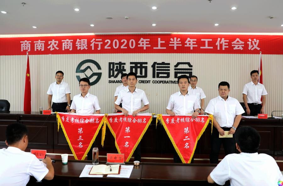 商南农商银行党委向综合考核第一名的农商银行营业部、第二名过风楼支行和第三名的金丝峡支行颁发流动红旗,兑现考核奖励。并向排名倒数的支行颁发黄牌,激励其迎头赶上。