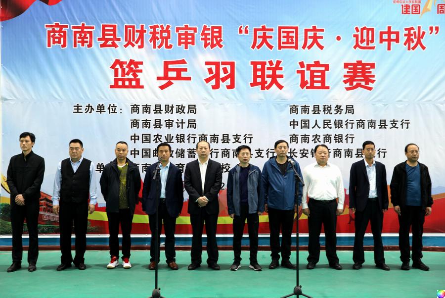 9月28日,商南县体育馆国歌嘹亮,这里正在举行商南县财税审银“庆国庆·迎中秋”篮乒羽联谊赛开幕式。8点30分,全体运动员、裁判员入场。各参赛单位领导参加开幕式。运动员、裁判员代表分别宣誓。商南县总工会常务副主席尹健雪致辞并宣布比赛开幕。商南县财政局副局长谭风主持开幕式。