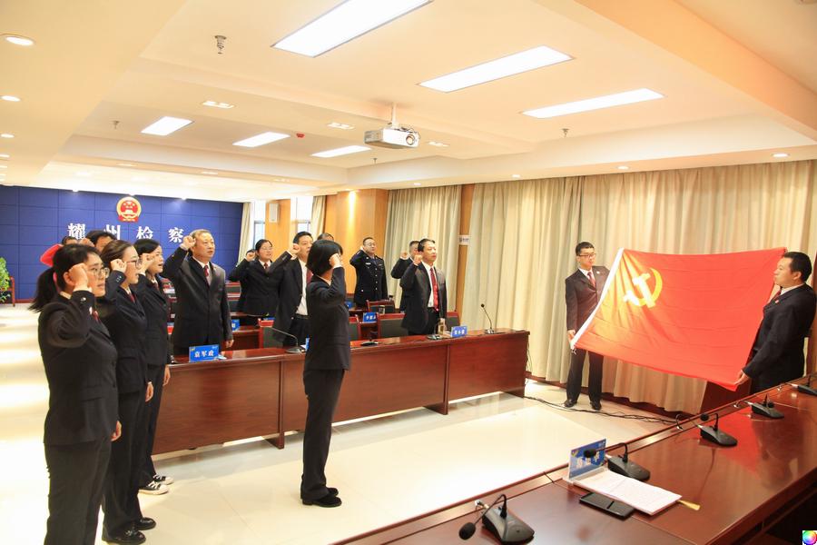 “我志愿加入中国共产党,拥护党的纲领,遵守党的章程,履行党员义务,执行党的决定,严守党的纪律,保守党的秘密,对党忠诚,积极工作,为共产主义事业奋斗终身……”。10月16日上午,由耀州区检察院党支部书记葛建华领誓,两名预备党员和一名新转正的党员紧握右拳,整齐肃立,面对鲜红的党旗向党和人民庄重宣誓,在场的党员也一起重温了入党誓词。