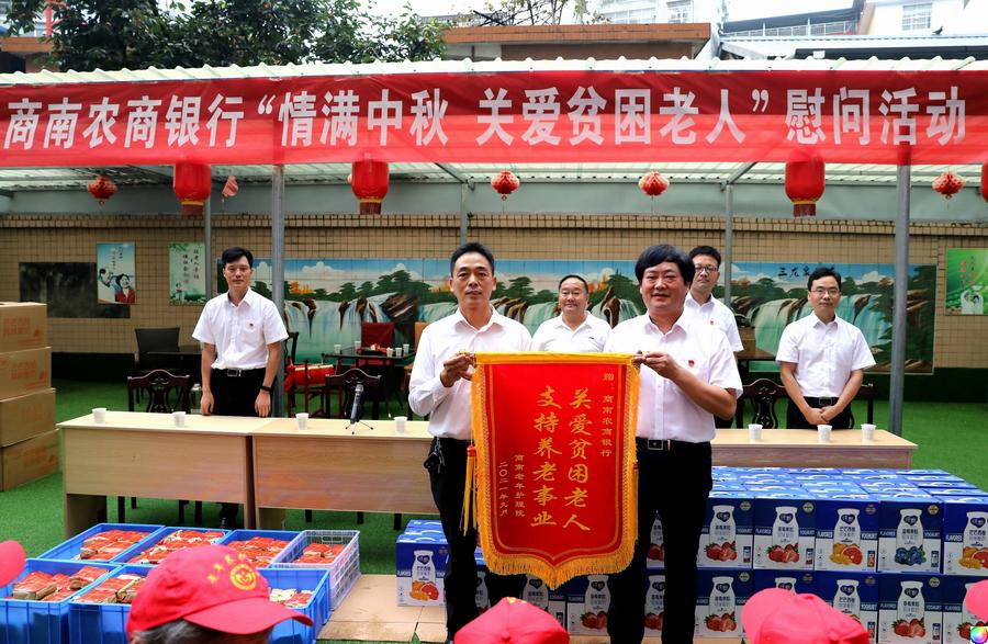 商南老年护理院送上一面“关爱贫困老人 支持养老事业”锦旗,表达对商南农商银行爱心奉献的敬意。