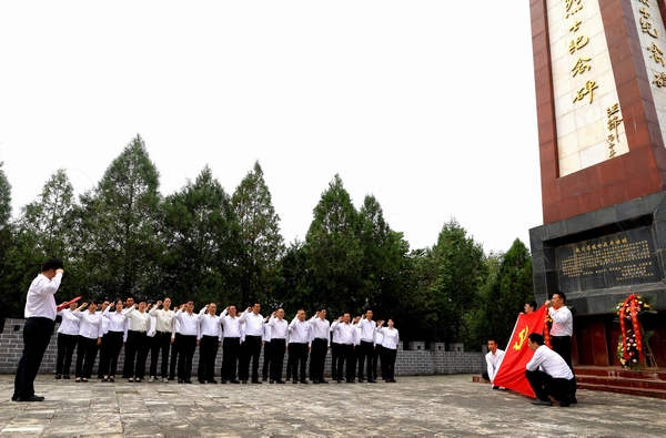 在烈士纪念碑前,面对党旗,省联社商洛审计中心一科科长何金波带领全体党员庄严宣誓,重温入党誓词。