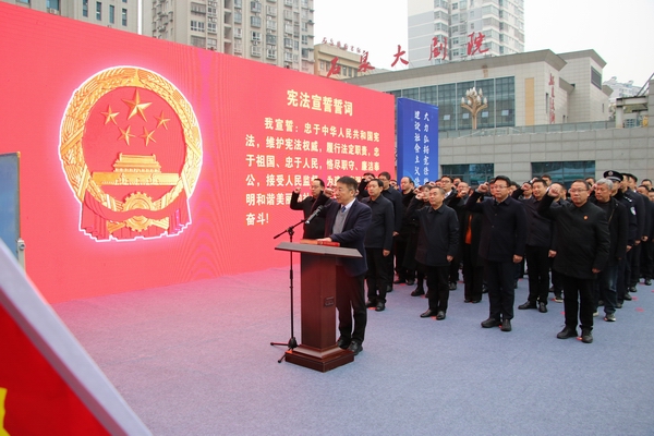 “我宣誓:忠于中华人民共和国宪法,维护宪法权威,履行法定职责,忠于祖国、忠于人民……”12月4日上午,石泉县委、县人大、县政府、县政协有关领导、政府各部门负责人、县法院和县检察院班子成员在领誓人带领下,身着正装,整齐列队,高举右拳进行宪法宣誓。