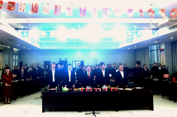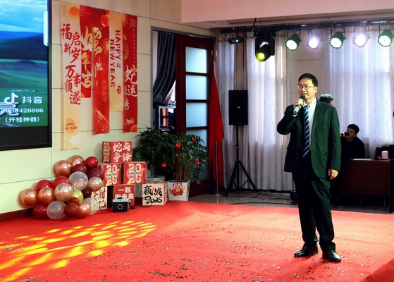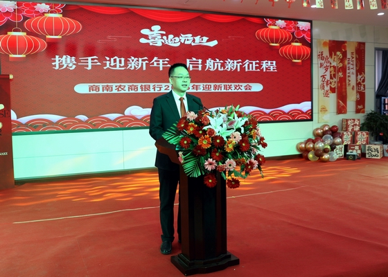 农商银行党委书记、董事长刘文新致辞。致辞回顾过去一年,全行上下团结一心、踔厉奋发,积极探索创新,优化工作流程,不断提升金融为民服务质效,为农商银行的发展注入活力,每一个奋斗瞬间,每一个目标实现,每一项荣誉的获得,都离不开全行干部职工的共同努力,业务经营呈现“稳中向好”良好态势,农商银行党委不断加强党的建设,提高党组织凝聚力战斗力,让党的旗帜在每一个工作岗位上高高飘扬。希望全行干部职工在新的一年携手同心、砥砺同行,鼓足干劲、勇往直前,凝聚奋进之力,赢得新辉煌。刘文新同志代表农商银行党委向任劳任怨、辛勤耕耘、乐于奉献的全行干部职工及家属致以衷心的感谢和节日美好祝福。