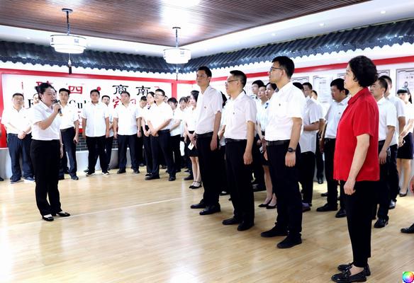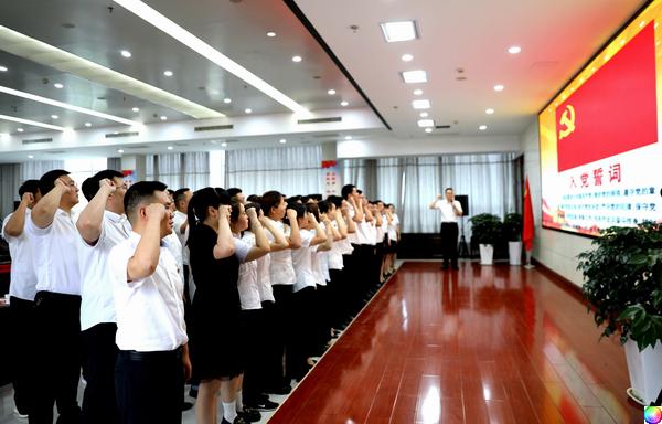 农商银行全体党员佩戴党徽,举起右手,紧握拳头,党委书记刘文新带领大家面对党旗,庄严宣誓,激励全体党员牢记初心使命、砥砺担当作为,以实际行动为党旗增光添彩。